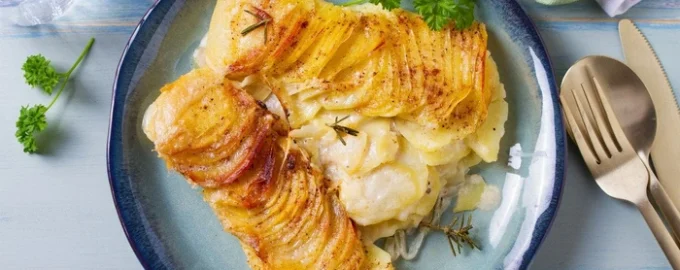 Valmistetaan hyvin yksinkertaisesti, leikkaa perunat ohuiksi ympyröiksi, aseta ne leivinmuottiin, kaada päälle kermaa, ripottele päälle juustoa ja paista uunissa.