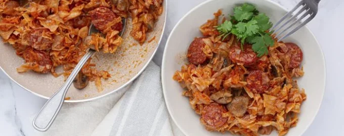 - Heitä seuraavaksi joukkoon hapankaali, kaada hieman lisää vettä. Hauduta vielä 15 minuuttia. Lisää lisää raakaa kaalia, hauduta vielä 15 min.